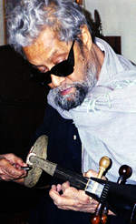 Kali describes his instrument and starts to play and sing. After about 4 songs, we move to another instrument a single string Ektara [ek - tara], a globe shaped gourd with a bamboo fork to stretch the string, the fork ending in a tuning peg. Kali sings a Bengali boatmen's song.